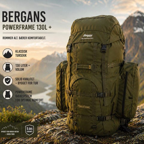 Med denne sekken på tur eller jakt er det ikke sekken som er begrensninga. Her får du plass til det meste og med høy bærekomfort selv med mye vekt i sekken. Mange festepunkter på fremsida av sekken i tillegg til volumet på 130 liter.