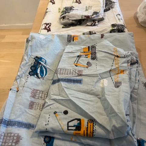 2 like med traktormotiv og 2 like med bilmotiv. Vanlig 'enkeltseng' størrelse på alle. 100 kr pr stk.