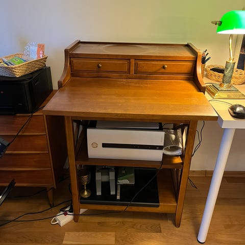 Vakkert og stilfullt skrivebord i (eik?) selges! Trenger litt kjærlighet oppå. 40-60 år gammelt?
