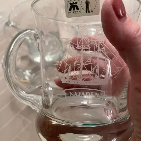 150 (pr stk) kr eller høystbydende. Gullkant og motiv er slitt.