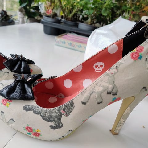 Kule retro sko, lite brukt, stått i skapet i flere år. Noen bruksmerker på kilehæl. En søm inni venstre sko som har åpnet seg, kan fikses hos skomaker. Str 39-40, noe små i størrelse.
