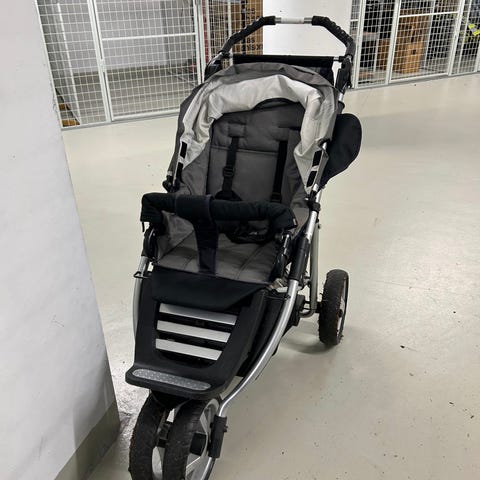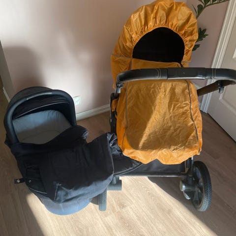 En av hjulen til vognen trenger pump luft det er for lite luft.bilstol til baby er littbrukt