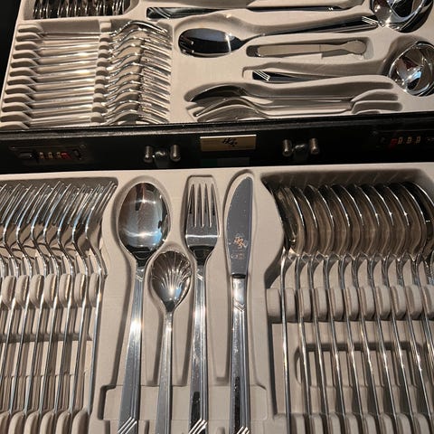 Sett med: kniv, gaffel, suppeskje og teskje 6 stk av hver. Til sammen 24 deler. Selges samlet.