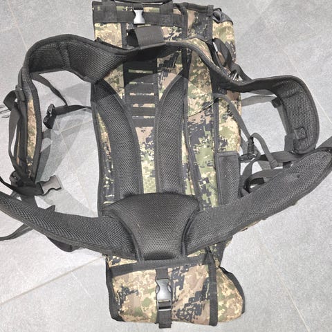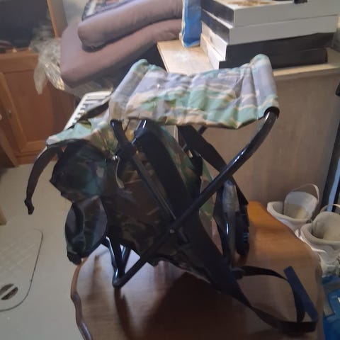 Ryggsekk med integrert stol i kamuflasjefarge. Passer til utendørsaktiviteter hvor både oppbevaring og sitteplass er nødvendig.