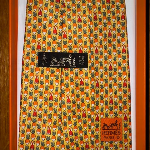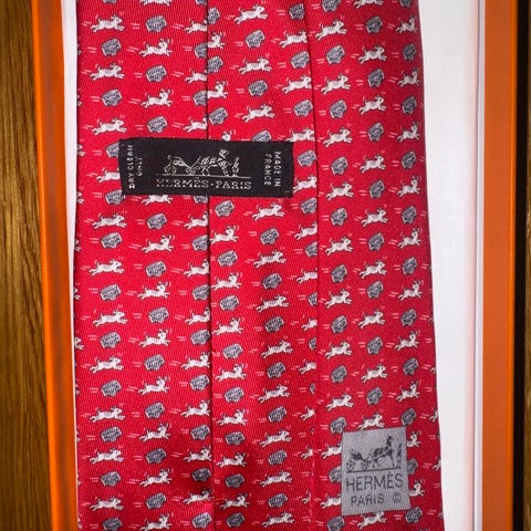 Rødt Hermès slips med bever, trær og måner - som nytt. Eske, konvolutt og pose kan følge med mot tillegg. Fin julegave til mann og herre