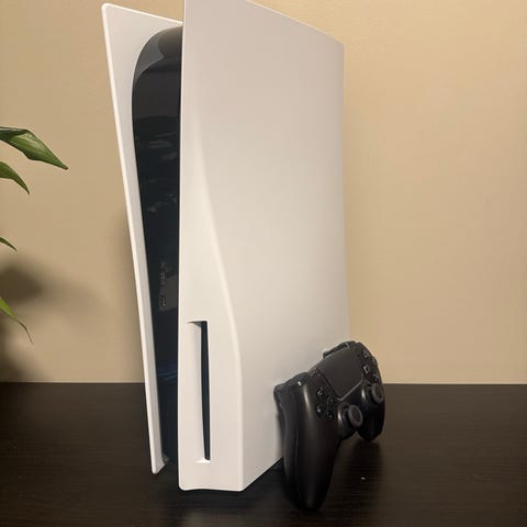 Sony Playstation 5 spillkonsoll med tilhørende kontroller. Konsollen har en moderne design med hvite og svarte farger. Kontrolleren er trådløs med ladekabel tilkoblet. Passer til bruk med Playstation 5 spill.