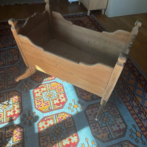 Selger denne vakre trevuggen da vi ikke har behov for den mer. Den har noen bruksmerker men er ellers pent brukt. Jeg har brukt den til mine tre små som variasjon til barnevogn. Skummadrass medfølger.