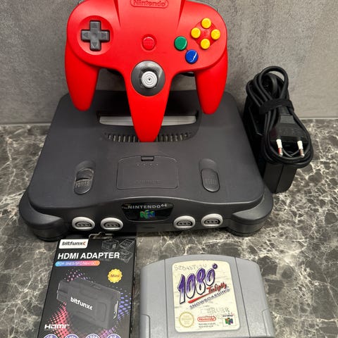 Clear Blue N64 konsoll med strømforsyning, HDMI adapter og kontroll med slitt joystick.
