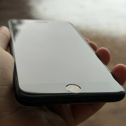 Selger en pent brukt iPhone 7 med ubrukte øreplugger.