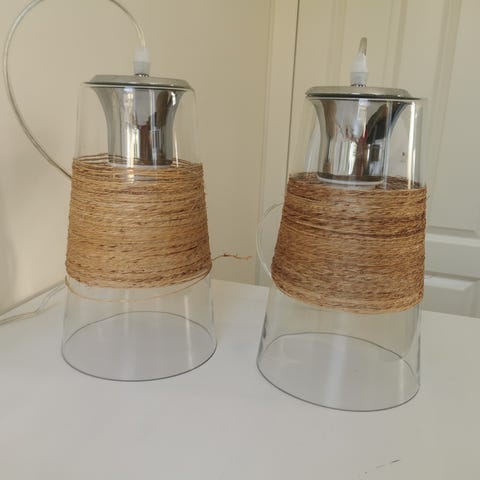 Sett med to bordlamper laget av bambus med en dekorativ svart bånd rundt midten. Lampene har en rund form og står på tre ben. Designet gir et mønster av lys og skygge når lampene er tent.