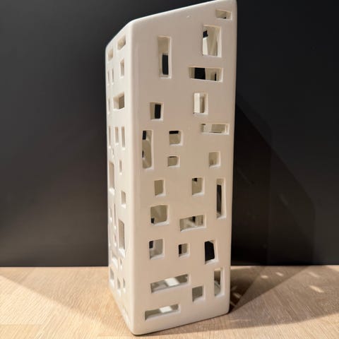 Urbania-lyshuset er et bilde på en modernistisk høyblokk, som med sine små håndmeislede vinduer sprer fantastiske silhuetter og forlokkende skygger. Lyshusets dyphvite glasur blir lyst opp som et levende og poetisk bilde på det mangfoldige byrom av bare ett enkelt telys. Skap en helt unik porselensby med Urbania-lyshusene, og nyt stearinlysets skjær inne såvel som ute. Hvis du har fått stearin på produktet, kan du med fordel helle varmt vann over produktet. Dette vil få stearinen til å smelte, slik at du lett kan tørke den av. Sett aldri lyshusene på et brennbart materiale. Bruk kun telys med folie og en brennetid på fire timer. Plasser alltid lyset midt i lyshuset for å unngå at varmen fra flammen forårsaker skader på produktet. For å unngå brannfare må lyshusene aldri dekkes til. Bredde: 75mm Høyde: 220mm