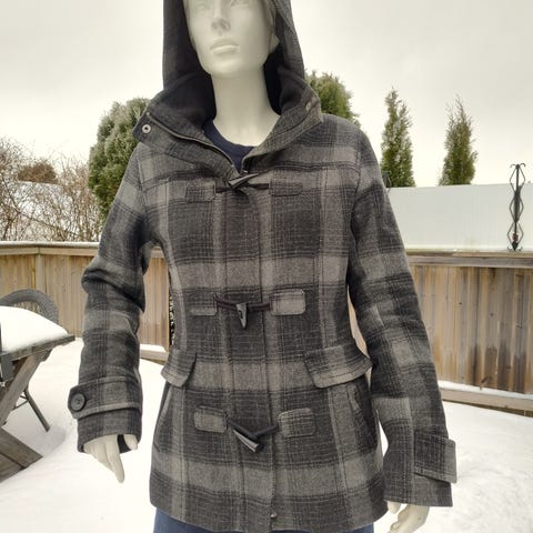 Napapirij jakke/düffeljakke til dame. Str. M/38. Rødmønstret ytterstoff i ullblanding, fóret med mørkeblått bomullsstoff (ikke vindtett). Koselig jakke med hette, stikklommer i front og fine düffelspenner. Knapt brukt! Selges svært rimelig for kr. 200,-.