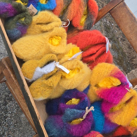 Masse småstrikk, tovede tøfler, sklisikring ( Rauma) , skjerf og pannebånd( Pus)