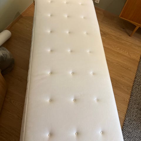 IKEA Snarum rammemadrass med stålbein og IKEA Talgje overmadrass.