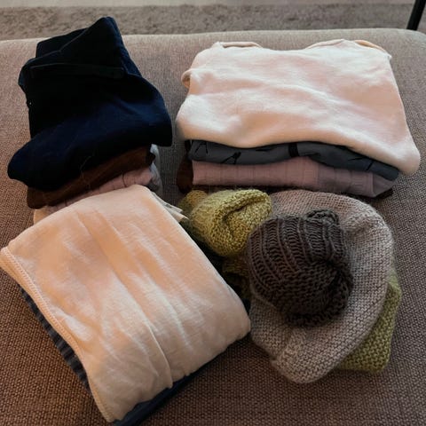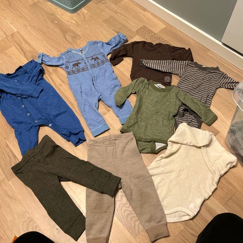 Stor klespakke / ullpakke i str. 62 og 62/68 – 21 plagg i ull eller ull-viskose