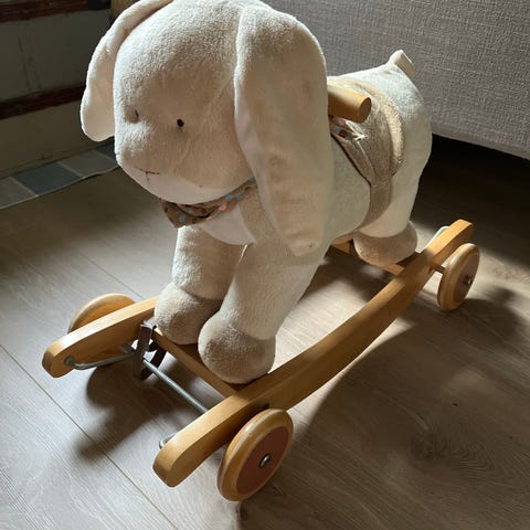 Teddykompaniet Kanin Gyngehest for barn. Myk og behagelig gyngehest formet som en kanin med beige og hvit farge. Utstyrt med sikkerhetsbelte og støttende sete for små barn.
