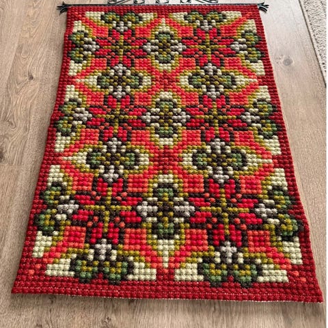 Tykt og fint teppe i beige bunnfarge med innslag av blå, lilla og sorte blomster.