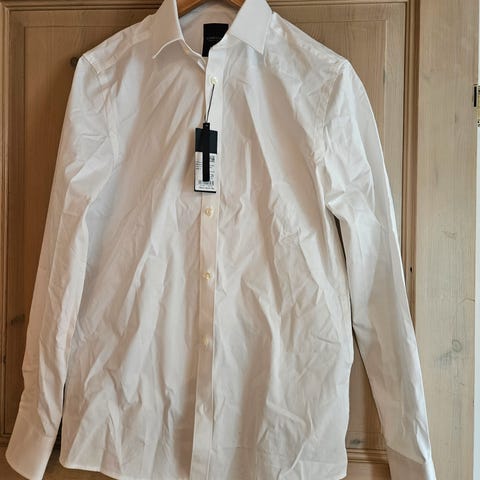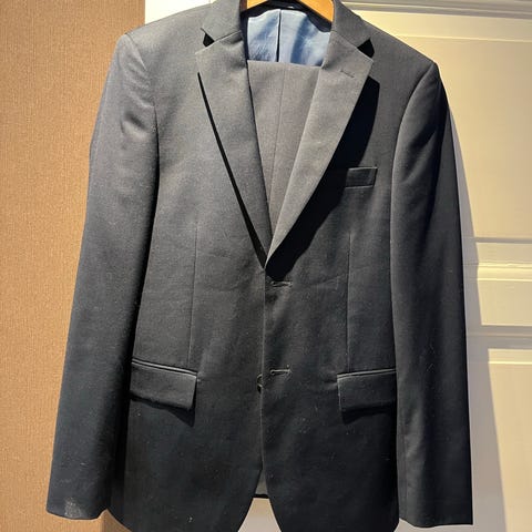 Meget pant brukt dress slimfit i mørk blå polyester/ull for herre, størrelse 46. Dressjakken har en klassisk utforming med knappelukking og flere lommer. Buksen er slim fit passform med knappelukking. Materialet består av 53 % polyester, 45 % ull og 2 % elastan/lycra, noe som gir komfort og holdbarhet. Brukt av ungdom ved 4 anledninger. Nypris 2499kr, kjøpt i 2024