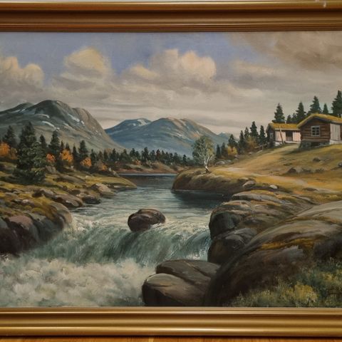 S. Hamnnes landskap oljemaleri som viser en naturskjønn dal med fjell, elv og hytter. Maleriet er innrammet i en dekorativ gyllen ramme. Signert av kunstneren S. Hammers.