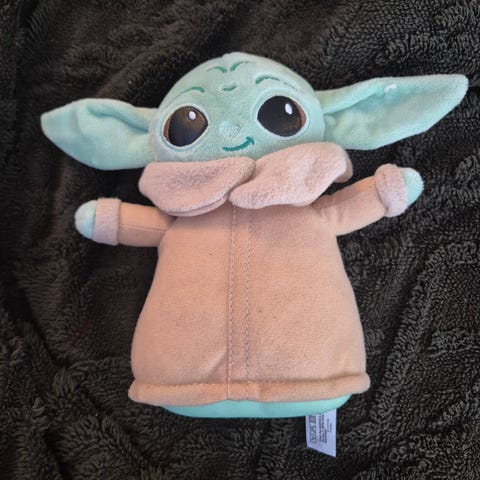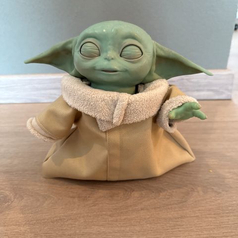 Kul liten baby yoda bamse som du kan vrenge og da blir den til mandalorian🤩
