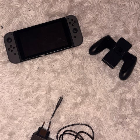 Nintendo Switch spillkonsoll med 2 Joy-Con-kontrollere i rødt og blått, dokkingstasjon, to rattkontrollere, tradisjonell spillkontroller og 7 spillkassetter og 3 nedlastede spill inkludert. Konsollen har en bærbar skjerm og kan brukes både som en håndholdt enhet og kobles til en TV via dokkingstasjon. Leveres med HDMI-kabel og strømkabel.