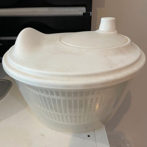 IKEA Salatslynge kjøkkenutstyr i hvit plast, brukt til å tørke salat og grønnsaker etter vask.