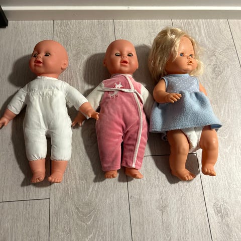 Eldre dukke laget av plast med bevegelige armer og ben. Dukken har blå øyne og en lydfunksjon på ryggen. Produktet er ment for barn.