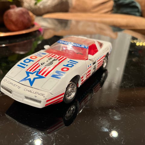 Chevrolet Corvette Modellsamling bil i rød og sølv farge. Detaljert modell av en klassisk sportsbil, egnet for samlere og bilentusiaster.
