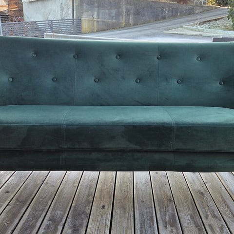 Sofa i grått stoff med rett design og firkantede armlener. Sofaen har ben i metall og en enkel, moderne stil. Passer til stue eller oppholdsrom.