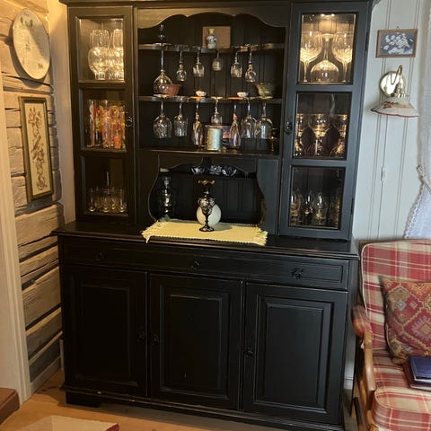 Pent vitrineskap med ettermonterte dimbare lys. Blått med pene detaljer. Skapet har god plass til alt for mye. Du får gjemt bort mye i underdelen som skjules med tette dører og det er plass til glass, boller med mer til store selskaper bak glassdørene.