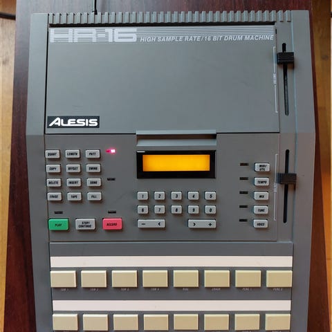 Original Alesis SR-16 trommemaskin fra 1996 med 16-bit stereo, dynamisk artikulasjon, 50 trommesamples og forhåndsinnstilte mønstre. Inkluderer strømforsyning og tilkoblingskabler. Med original strømforsyning og eske.