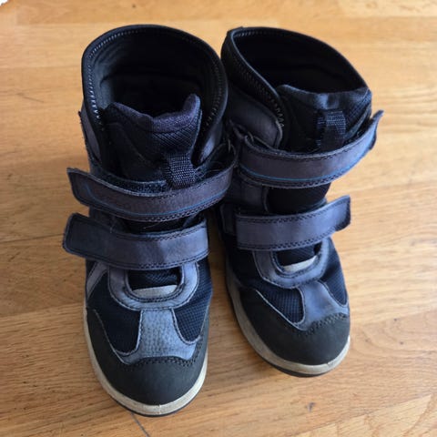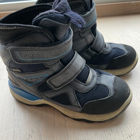 ECCO snowmountain vintersko unisex størrelse 36 i farge blå og svart. Skoene har borrelåslukking og gummisåle med godt mønster for grep. Gore-Tex. Brukt av ett barn en sesong. Trenger nye innleggssåler da jeg ikke finner igjen de som fulgte med.