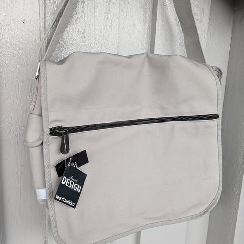 Glidelåslukning, justerbar skulderstropp, åpen lomme både på inn- og utsiden. Nøkkelring.