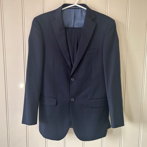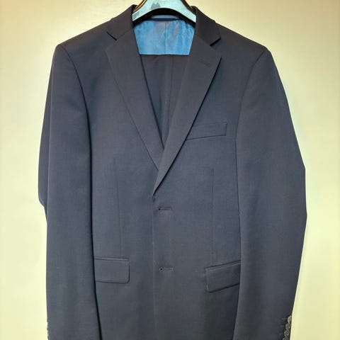 Tilnærmet ubrukt dress i mørk blått, brukt 2 ganger før den ble for liten. Lommer med klaff utenpå, 3 mindre lommer på innsiden av jakken. Nydelig mellomblå farge på foret og røde detaljer. Slim fit. 45 % ull, 53 % polyester. Lettstelt, klassisk og flott, en dress å føle seg fin i! Ingen flekker eller hull. Sender gjerne.