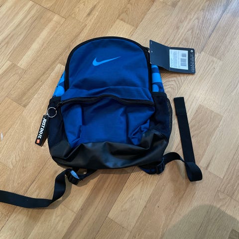 Liten Nike ryggsekk laget av stoff i blå farge. Designet for unisex bruk. Har justerbare skulderstropper og flere lommer for oppbevaring. Passer til daglig bruk og turer.