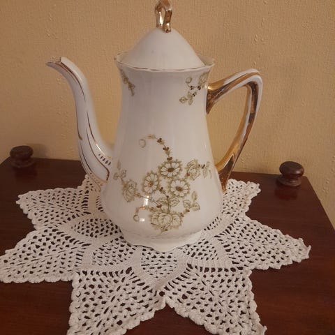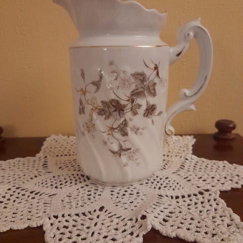 Porsgrund Porselen kanne i porselen med blomsterdekor. Porsgrund Porselen melkekanne i porselen med blomsterdekor. Begge har dekorative detaljer og er laget i porselen.