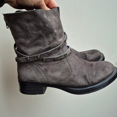 Pent brukte svarte skinn skoletter/lave boots med spiss tå. Nydelig skinn ut- og innvendig. Glidelås på innsiden. Pene til skjørt og kjole, - og selvsagt til bukser. Skolettene er fra det norske merket Epilogue. Vil si de er normal i størrelsen.