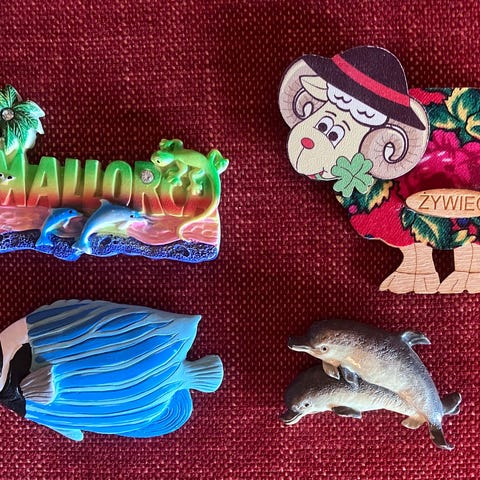 Et utvalg av suvenirmagneter med motiver fra forskjellige byer og land. Magnetene varierer i form, størrelse og design, og inkluderer kjente landemerker og bynavn. Passer for samlere eller som dekorasjon på kjøleskap eller andre magnetiske flater.