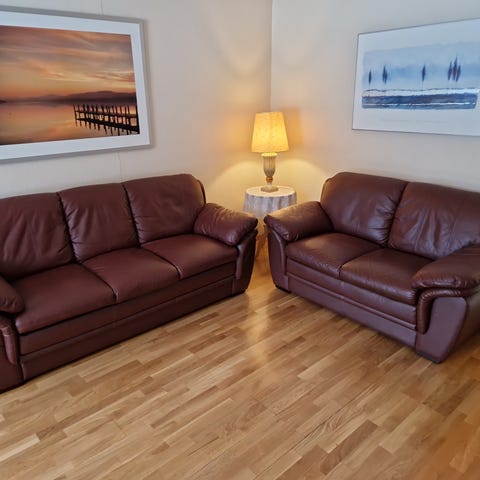 Svært lite bruksmerker. Hull i stofftrekket under på begge sofaene, men det er helt uten betydning.
