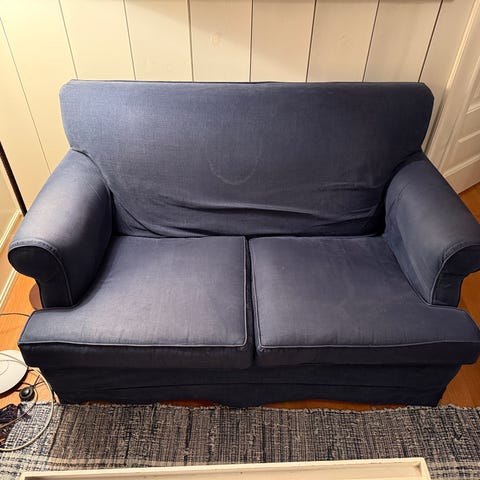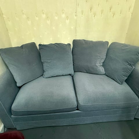 Sofa er veldig pent brukt, uten synlige skader. Veldig godt å sitte i. Nøytral blå farge. Må hentes. Kan være behjelpelig med frakt i nærområdet.