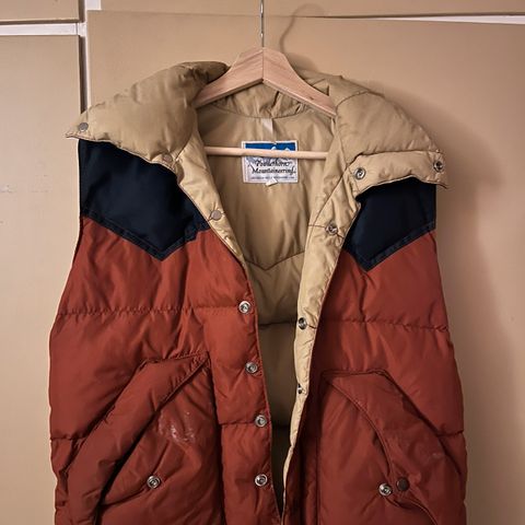 Dunjakke fra amerikanske Powderhorn Mountaneering (modellen heter kanskje The Original LT). Passer menn (small/medium) og kvinner (medium/stor medium). Ermene kan tas av slik at jakken blir en vest. I god stand, noen bruksmerker på ermer som avbildet. Kjøpt på salg på Revir for flere år siden for ca. 2600 kr, originalpris rundt 3000. Hentes/prøves på Torshov eller sendes mes posten.