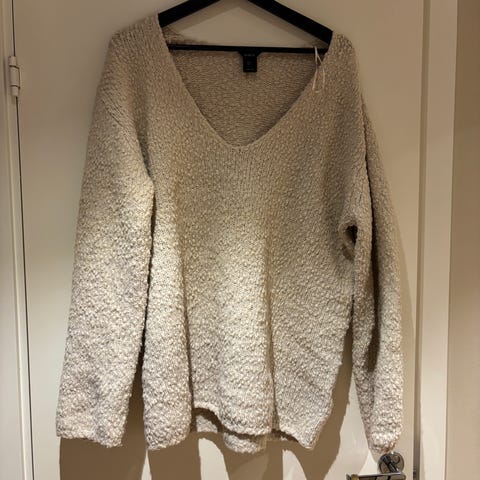 Ny med lapp, strikket genser i ull og mohair, farge tåkebrun, størrelse small. H&M Premium Selection. En oversized genser i myk, strikket kvalitet med innslag av mohair og ull. Lav skuldersøm, lange ermer og ribbestrikket kant rundt halsen, nederst og på ermene. Original pris 799 kr. Blir ev. returnert. Mohair 32%, ull 32%, polyamid 33%, elastan 3%