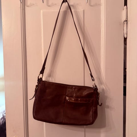 Lekker rød veske i mykt flott skinn 32 cm bred 34 cm lang. Kan brukes på 2 måter. Stropp kan henges 2 steder og få mindre veske. Denne veske er brukt 2 ganger og er som ny.