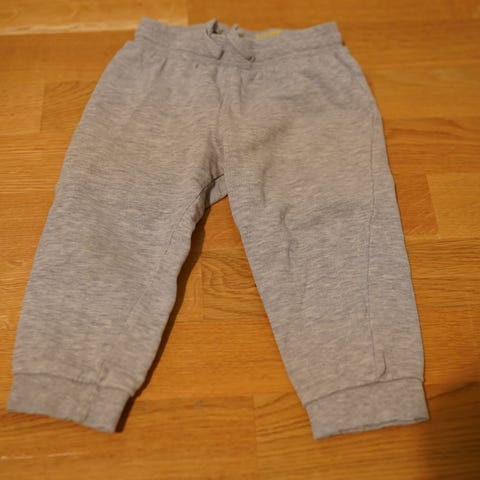 Arket barn bukse i størrelse 86, laget av bomull. Buksen er grå og designet for unisex bruk. Den har elastiske mansjetter ved bena og en lomme med bokstaven 'A' på baksiden.