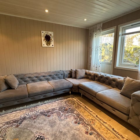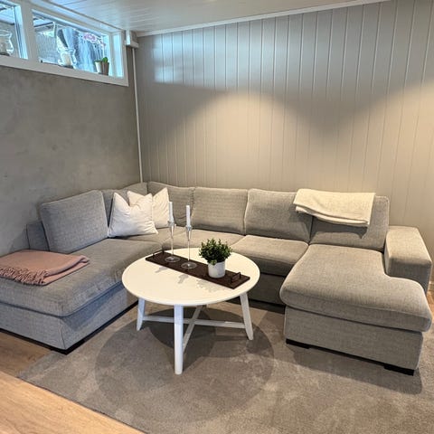 Pentbrukt sofa med puff og sofabord, selger dem på grunn av størrelse den er ganske stor og passer dessverre ikke min stua men den er veldig myk og pen og man kan sove på lett. Sofabord følger med om ønske.