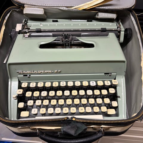 Olivetti Lettera 32 skriveemaskin i svak grønn farge. Produsert i Barcelona Spania rundt 1968-69, serienummer 5403489. Original med flott veske. Inkludert kopi (PDF) av original bruksanvisning på engelsk i farge. Ingen synlige feil eller skader. Må hentes på adresse.