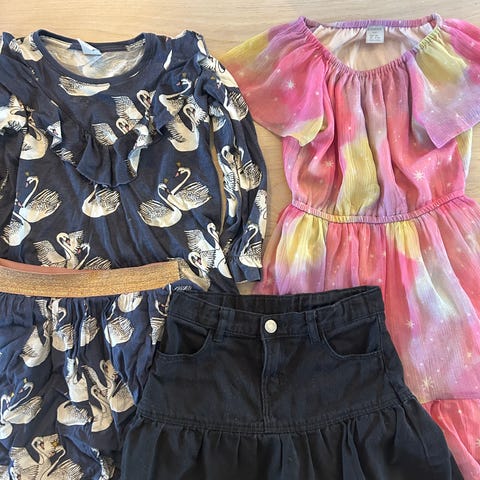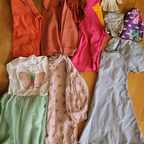 Klespakke for jente i størrelse 110-116. Inneholder ulike plagg som t-skjorter, skjørt, bukser og genser, hansker. Noen helt nye.