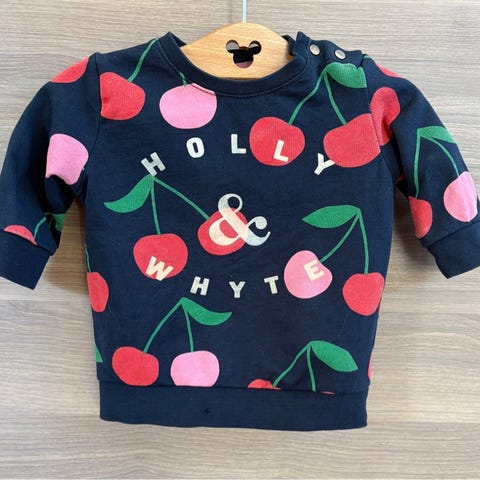 Mønstret collegegenser med kirsebær. Siste bilde viser hvordan den ser ut helt ny, men fargene har blitt svakere. Men masse bruk igjen i den søte genseren. Første bilde er lånt fra en annonse for en lik genser i størrelse 68 som er tatt i et bedre lys.