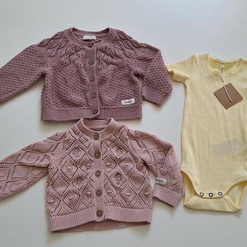 Klespakken inneholder 1 høst/vår jakke fra Nameit, cardigan fra Newbie, 2 stk pysjamas fra HM og 2 stk pysjamas fra Reflex.
