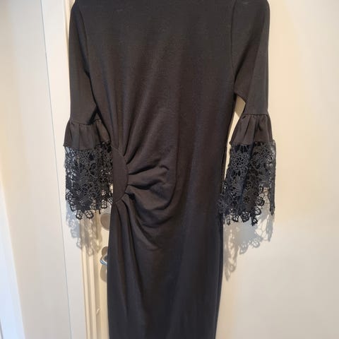 Kjolen er meget pent brukt. Størrelse 42. Brystmål fra armhule til armhule er 49 cm, og hel lengde fra skulder og ned er 91 cm. Ingen materiallapp, men trolig polyester og elastan/spandex.